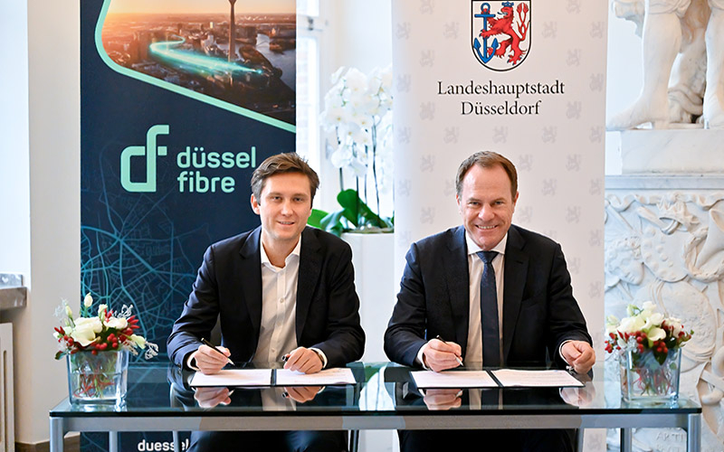 Düsseldorf, 25. Oktober 2023. Bis 2030 will Oberbürgermeister Dr. Stephan Keller ganz Düsseldorf mit Glasfaser versorgen. Um Tempo und Struktur in den Ausbau der dringend benötigten Glasfaserinfrastruktur zu bringen, ist die Stadt in Gesprächen mit verschiedenen Anbietern. Als festen Partner stellte die Landeshauptstadt heute „düsselfibre“ vor, der rund 100.000 Haushalte in 14 Stadtteilen, vor allem im Düsseldorfer Norden, an das Hochgeschwindigkeitsnetz anschließen soll. Mit düsselfibre kommt das erfolgreiche Modell „ruhrfibre“ aus Essen jetzt auch nach Düsseldorf. Heute unterzeichneten Oberbürgermeister Dr. Stephan Keller und metrofibre-Geschäftsführer Christopher Rautenberg im Düsseldorfer Rathaus die gemeinsame Absichtserklärung.